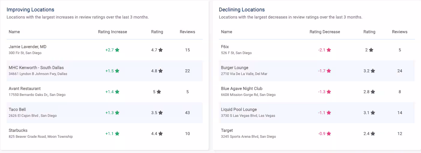 The Improving and Declining Locations snapshot panes display the 5 locations that have improved or declined based on star rating over the last 3 months. Clicking on the drill-in icon will take you to the Location Comparison report if enabled on your account.
